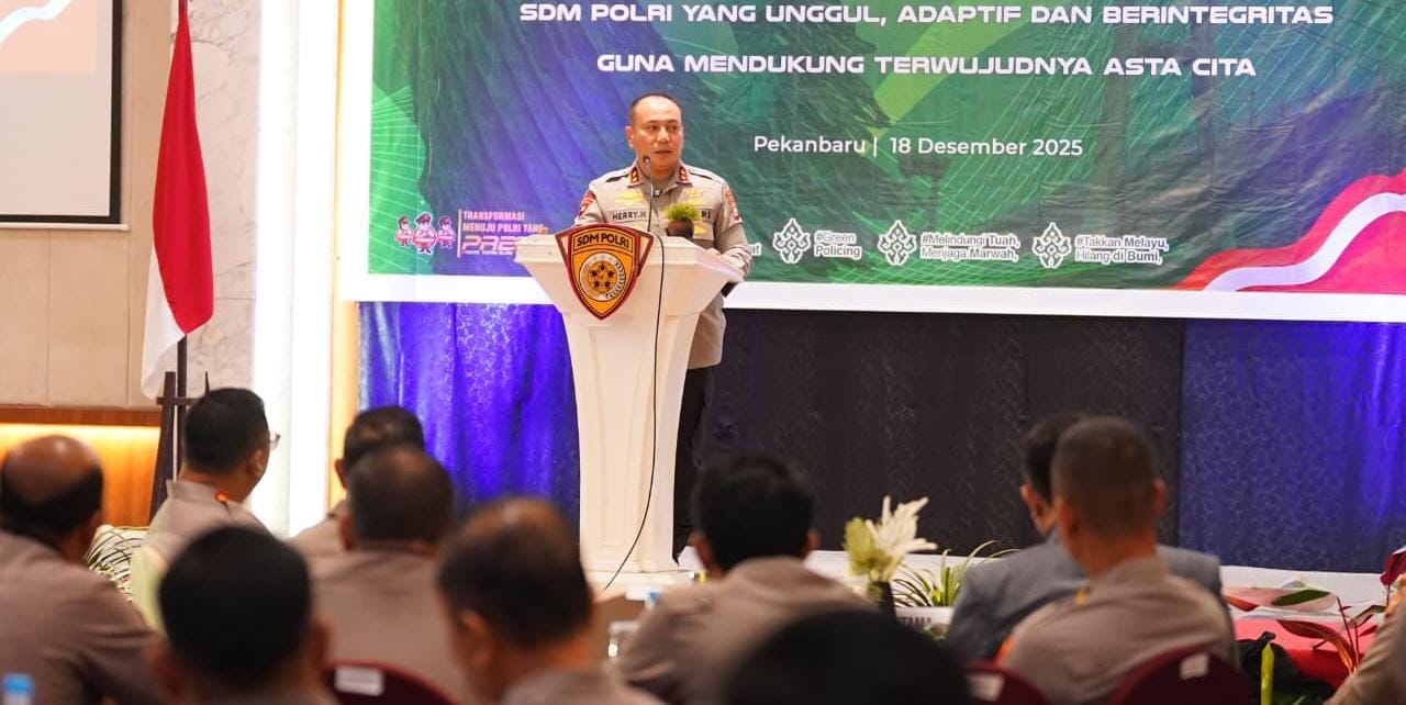 “Rakorbin SDM ini merupakan momentum strategis untuk melakukan evaluasi pembinaan SDM tahun 2025 berjalan sesuai kebjakan dan langkah konkret pembinaan SDM di wilayah hukum Polda Riau,” ujar Irjen Herry Heryawan, Kamis (18/12/2025).
