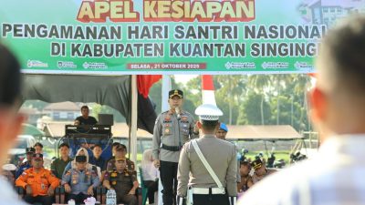 KUNTANSINGINGI,Nusantarazona.com– Dalam rangka memastikan keamanan dan kelancaran pelaksanaan Hari Santri Nasional (HSN) Tahun 2025, Polres Kuantan Singingi menggelar Apel Pengamanan Hari Santri Nasional di Eks Pelatihan Taman Jalur Kota Teluk Kuantan, Selasa (21/10/2025) pagi.