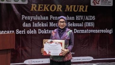 Nusantarazona.com,Pekanbaru, INFO_PAS – Lembaga Pemasyarakatan (Lapas) Kelas IIA Pekanbaru bersama Perhimpunan Dokter Spesialis Kulit dan Kelamin Indonesia (PERDOSKI), sejumlah lembaga pemerintah, serta berbagai pihak terkait lainnya berhasil mencatatkan capaian Rekor Museum Rekor-Dunia Indonesia (MURI) melalui kegiatan penyuluhan pencegahan HIV/AIDS dan Infeksi Menular Seksual (IMS). Pemerintah Provinsi Riau hadir sekaligus memberikan sambutan dalam agenda penyerahan piagam yang digelar di Hotel Tjokro Pekanbaru, Senin (26/1/2026).